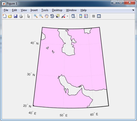 البته در رابطه با استفاده از اطلاعات خود نرم افزار باید گفت که MATLAB از قبل محدوده های جغرافیایی مشهور را تعریف کرده است. لذا شما می توانید محدوده جغرافیایی خود را به راحتی تهیه کنید. به فرمان های ذیل توجه کنید که کشور ایران را در کانون نقشه قرار می دهد.